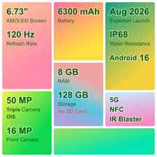 - Isme AMOLED display diya gaya hai jo bright colors, deep blacks aur smooth scrolling experience deta hai. High refresh rate ke karan gaming aur social media use karte time phone kaafi fluid feel hota hai. Slim bezels aur curved edges isse ek flagship-style look dete hain.